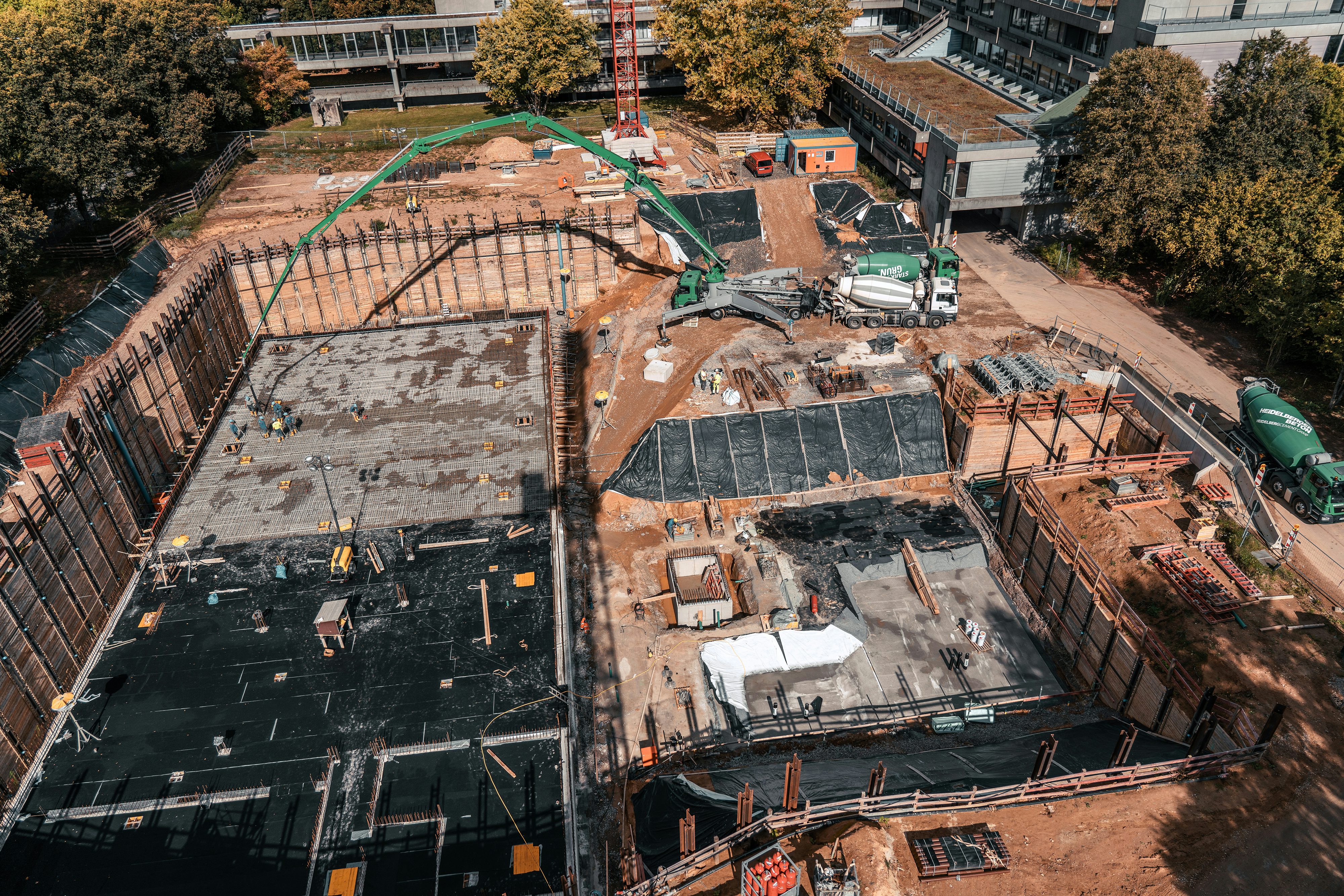Aufgrund der hohen Bodenplatten- und Deckenstärke im Bereich von einem bis 1,2 Metern ist das Gebäude sehr massiv, was den Einsatz von aufwendigen Schalungs-Tragkonstruktionen sowie langsam erhärtendem Beton zur Sicherstellung der Rissbreitenbegrenzung bedarf. Die Experten der JR Unternehmensgruppe passen in Zusammenarbeit mit Tragwerksplanung, Betonlieferant, Betonlaborant und Projektleitung die Betonrezeptur an, um die Hydratationswärmeentwicklung gering zu halten. Verwendet wird ein langsam abbindender CEM III-Zement. Für die Bodenstabilisierung kommt das CSV-Verfahren zum Einsatz. Circa 3 000 CSV-Säulen vernadeln den Boden und verbessern so dessen Tragfähigkeit.